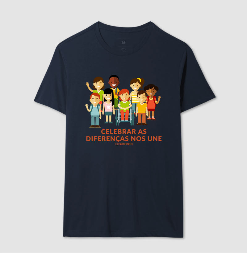 Celebrar as Diferenças III - Esta camiseta é um lembrete de que cada pessoa, com suas diferenças, contribui para uma sociedade mais forte e empática. Feita em algodão 100%, proporciona conforto e significado em cada detalhe. Vista essa mensagem de inclusão e celebre a beleza de sermos únicos! 💙💛💜💚 #OrgulhoAtípico
