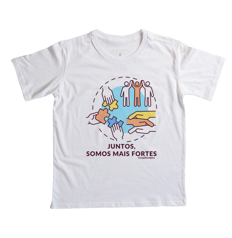Juntos Somos mais Fortes II- Esta camiseta é um lembrete de que cada pessoa, com suas diferenças, contribui para uma sociedade mais forte e empática. Feita em algodão 100%, proporciona conforto e significado em cada detalhe. Vista essa mensagem de inclusão e celebre a beleza de sermos únicos! 💙💛💜💚 #OrgulhoAtípico
